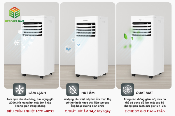 Máy được thiết kế tích hợp cả cục nóng và cục lạnh trong cùng một thiết bị, giúp việc sử dụng trở nên đơn giản hơn rất nhiều. Người dùng không cần lắp đặt phức tạp, không cần khoan tường hay can thiệp vào kết cấu công trình. Chỉ cần đặt máy ở vị trí phù hợp và kết nối ống thoát khí nóng ra bên ngoài là có thể sử dụng ngay. Theo kiểm nghiệm thực tế của BPS Việt Nam, tại đầu ống khí lạnh của máy có thể đạt mức nhiệt khoảng 16 độ C.